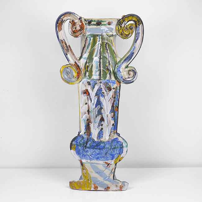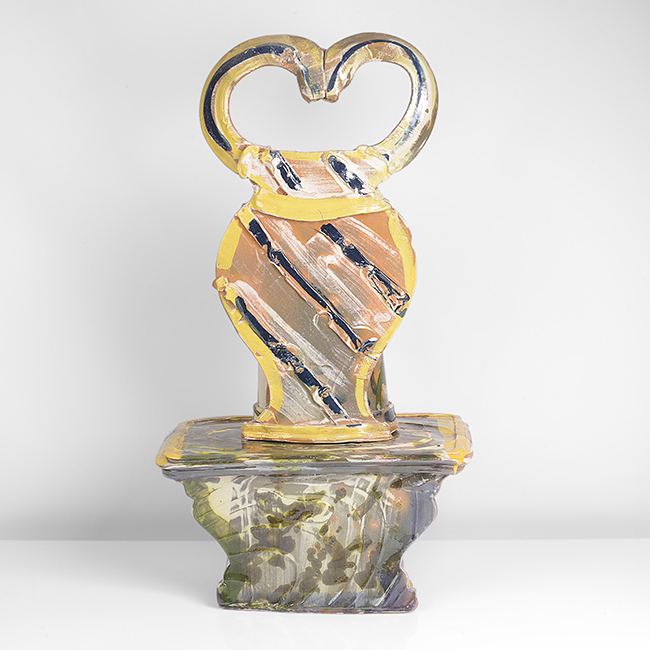 Betty Woodman’s nearly seventy-year career began when she was introduced to pottery classes aged 16, going on to study at the School for American Craftsmen at Alfred University in New York. She started making domestic wares, but soon moved into the experimental and exuberant works for which she is best known. She frequently used traditional vessel forms, often vases, as a starting point and deconstructed and distorted them, and her works are distinctive for their decorative surfaces with brightly coloured glazes and bold patterns. Both forms and decoration take inspiration from diverse sources – traditional Italian maiolica, classical Greek and Roman vases and architecture, Cubist painters, patterns in fabrics, quilts, and wallpapers – amongst others. Her later works became more sculptural, taking the vessel form and turning it into something more abstract with multiple view points and planes.