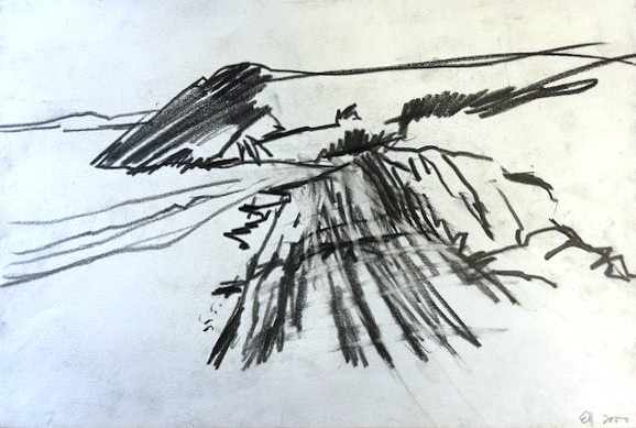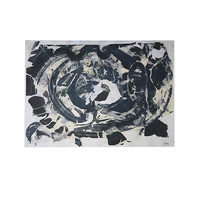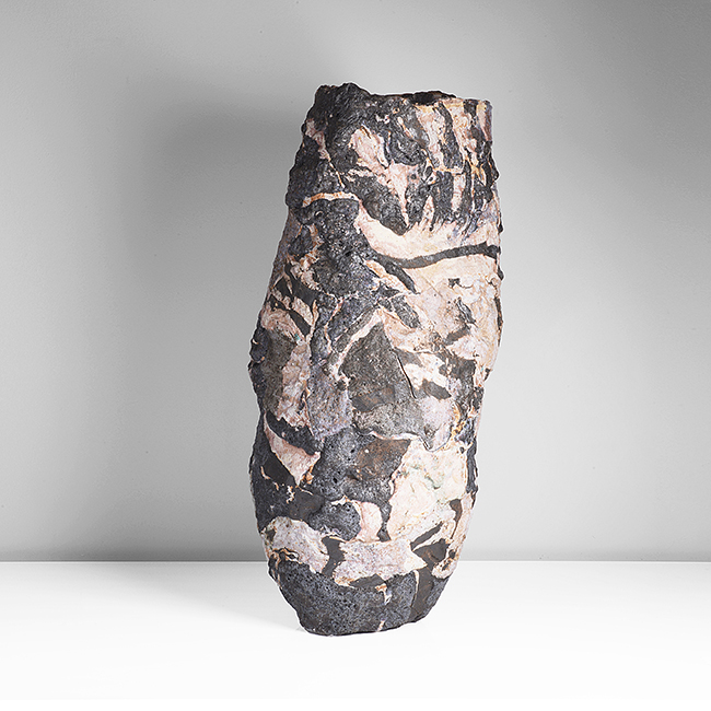 Mixed laminated clays, dry textured surface in cream, pale pink, blue and brown, with natural tears and fissures to the convoluted form