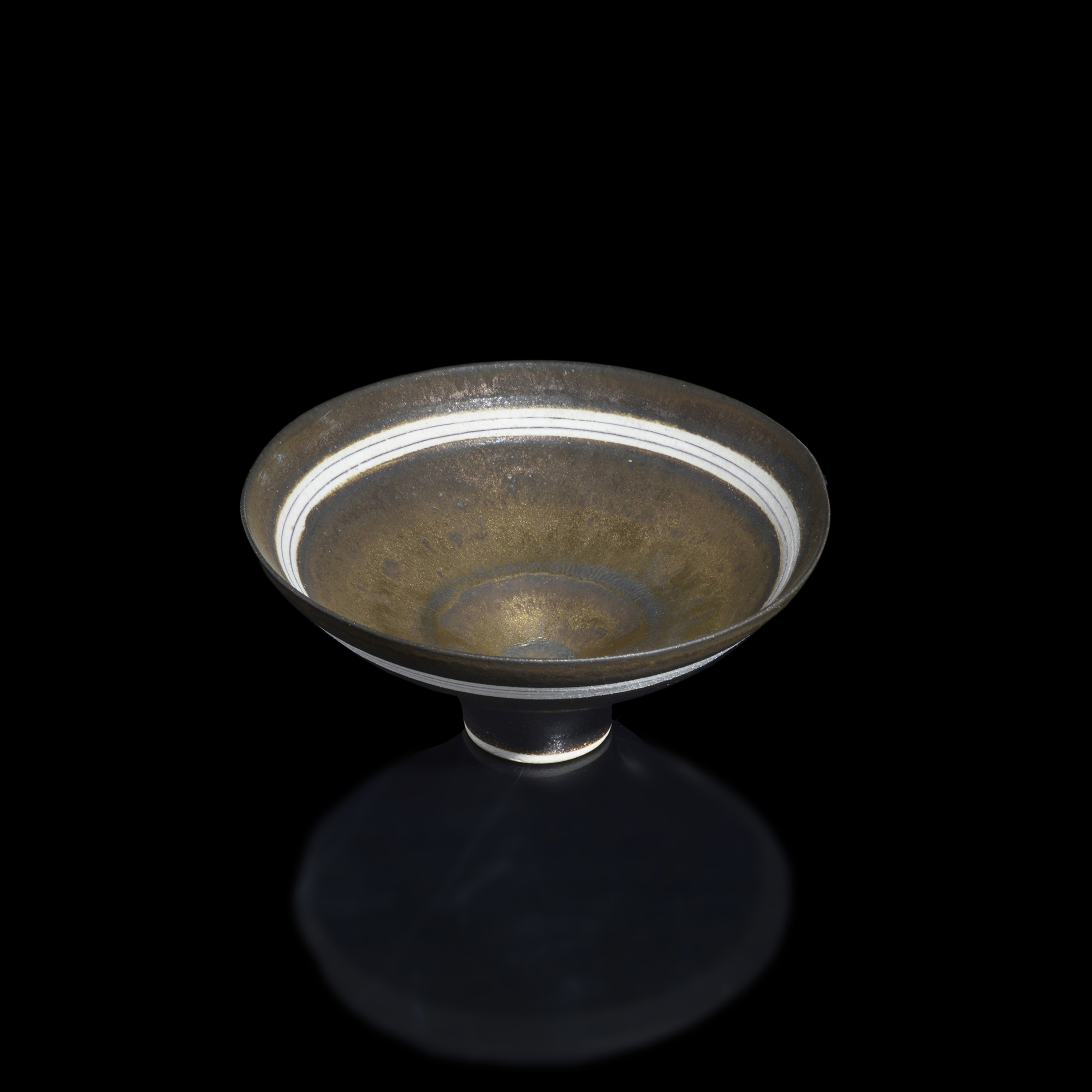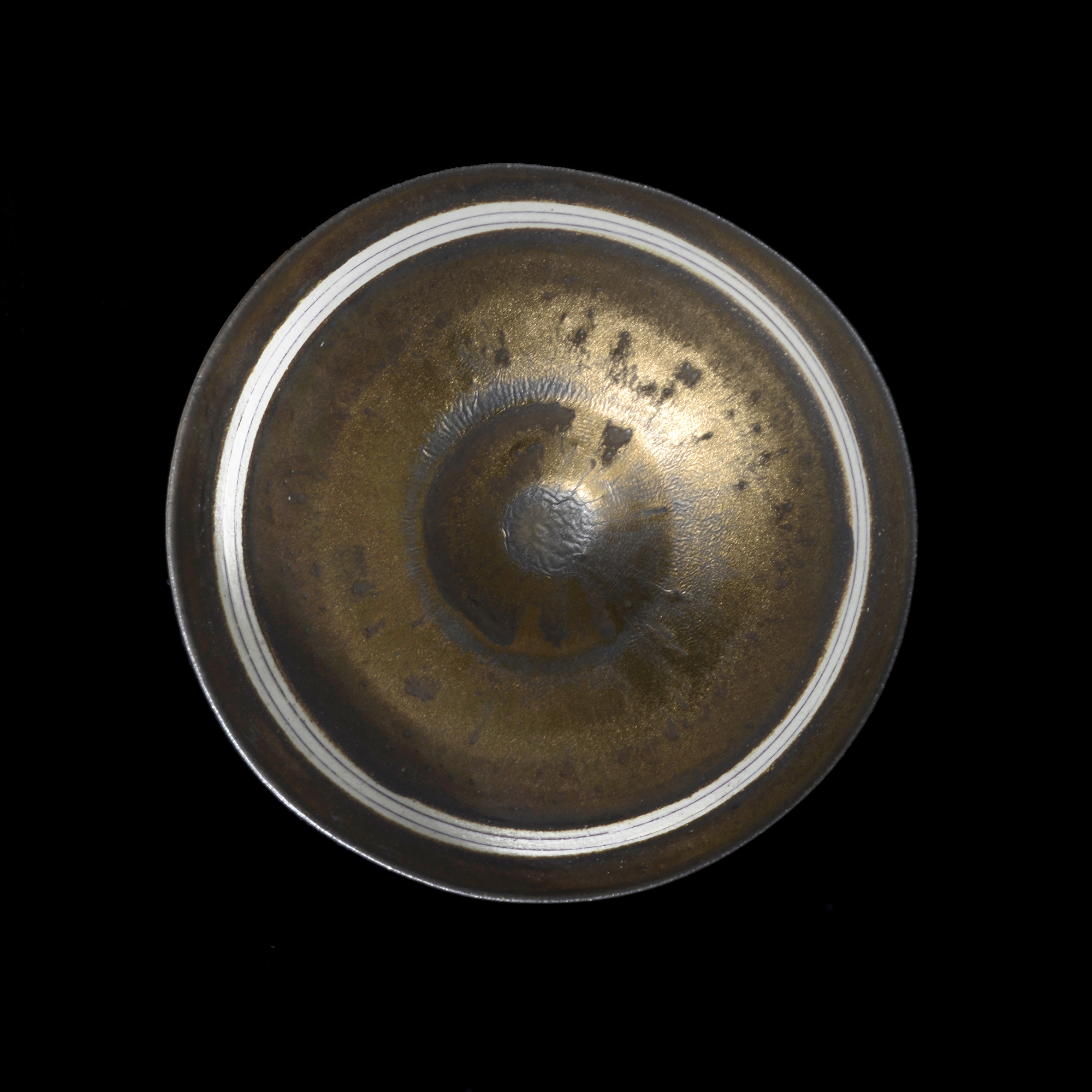 Porcelain, manganese glaze running bright gold in the well, an unglazed band running below the rim inside and out containing two fine lines inlaid with blue, impressed LR seal