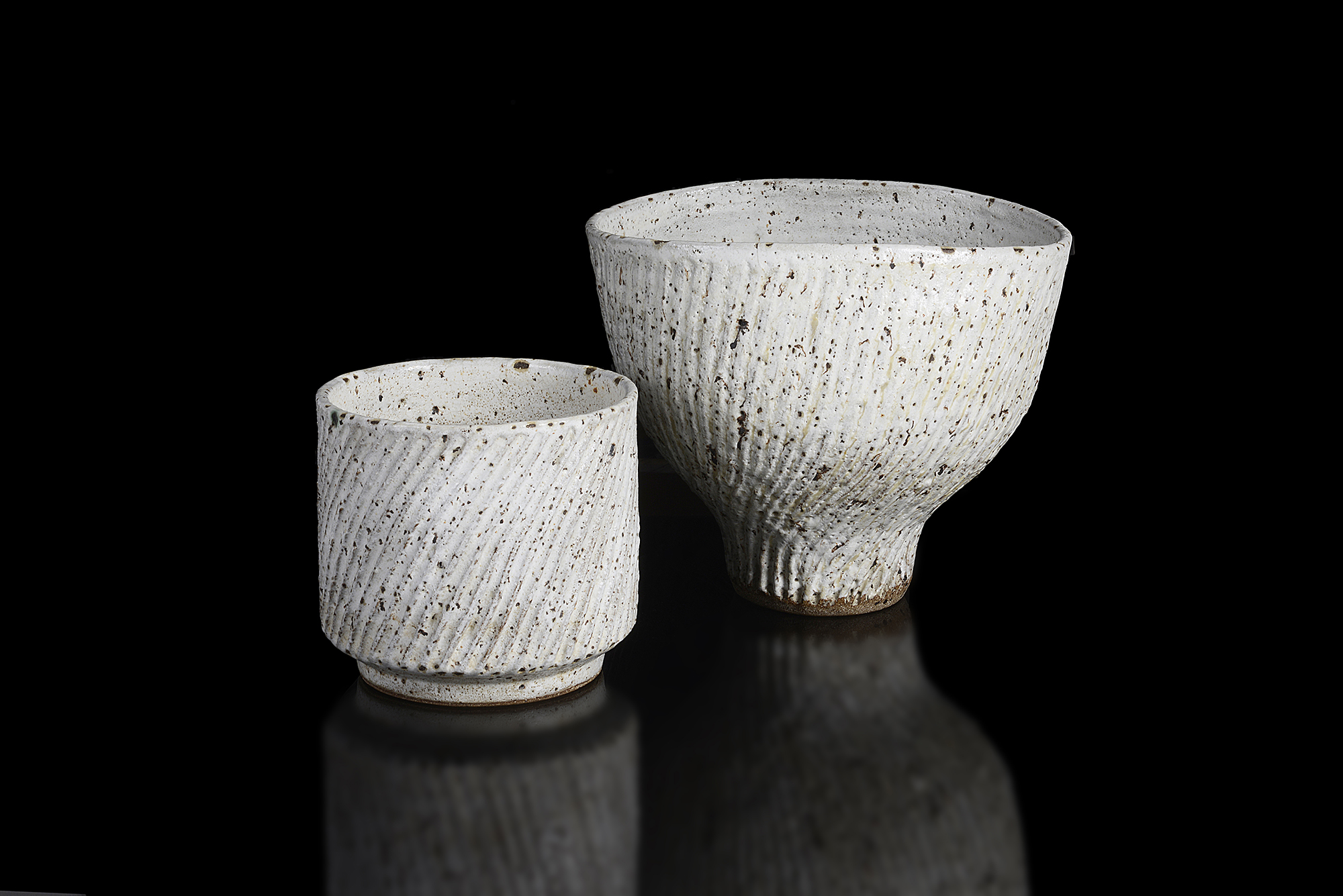 Below: Lot 96 Lucie Rie (Austrian/British, 1902-1995), Cylindrical Fluted Bowl, circa 1956, Est. £3,000-4,000 & Lot 97 Lucie Rie (Austrian/British, 1902-1995), Large Fluted Deep Bowl, circa 1956, Est. £5,000-7,000
